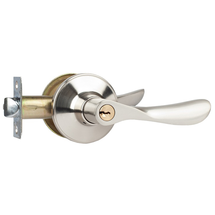Снаружи дверь закрывается на ключ, изнутри - на фиксатор.
