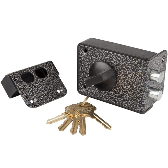 Накладной замок с двумя цилиндрическими ригелями без защелки